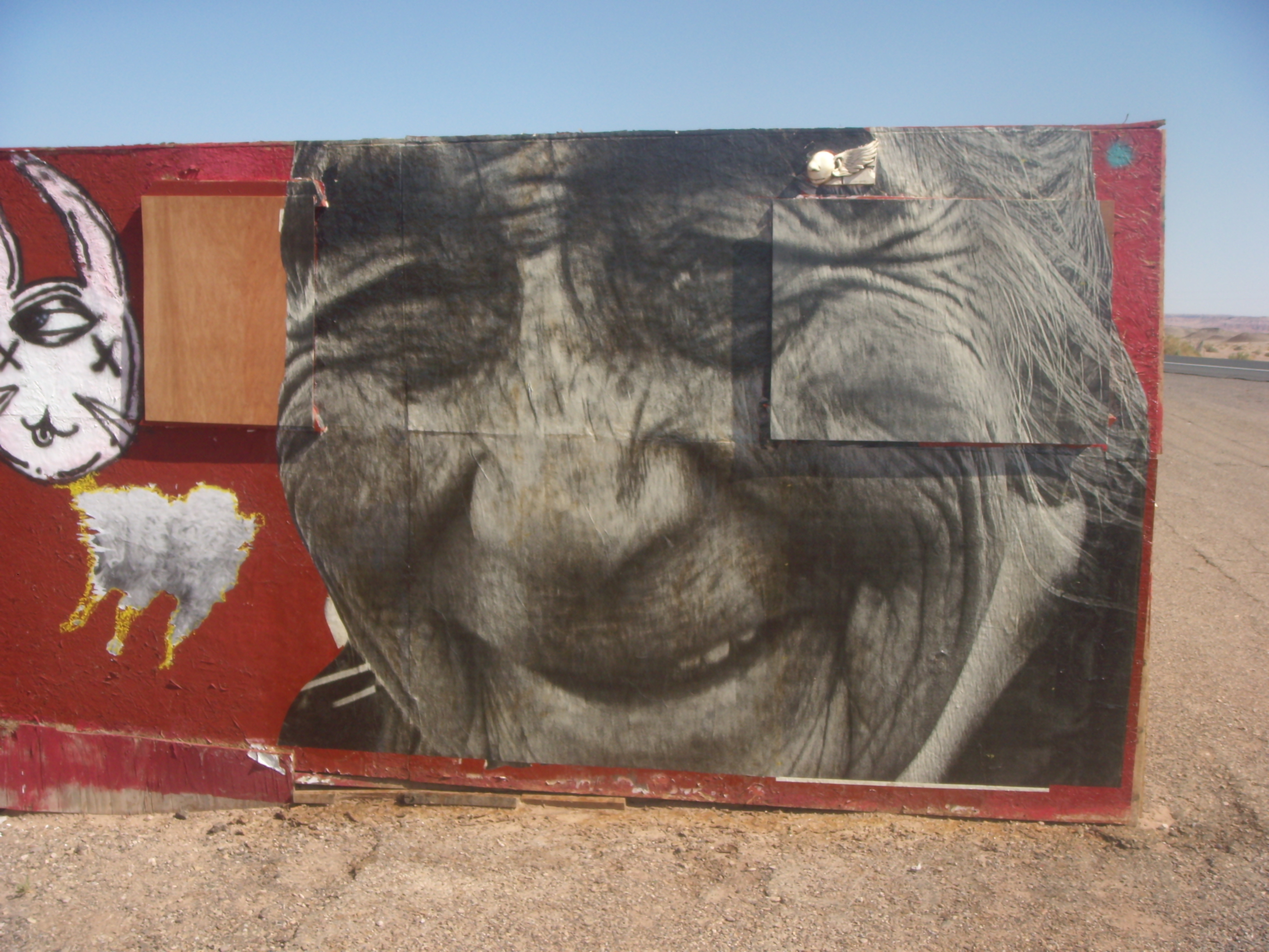 The top image and the bottom one were supposed to have been together (Oh well), but they were taken outside of Tuba City, AZ. I’ve been a fan of street art for a while and when I saw these I had to stop and snap them. My sister told me about the artist who are doing them and once I find out, I will let you know. But, more importantly, I like the idea of using “traditional,” images of Navajos and putting them in a context like this. It is highly original.