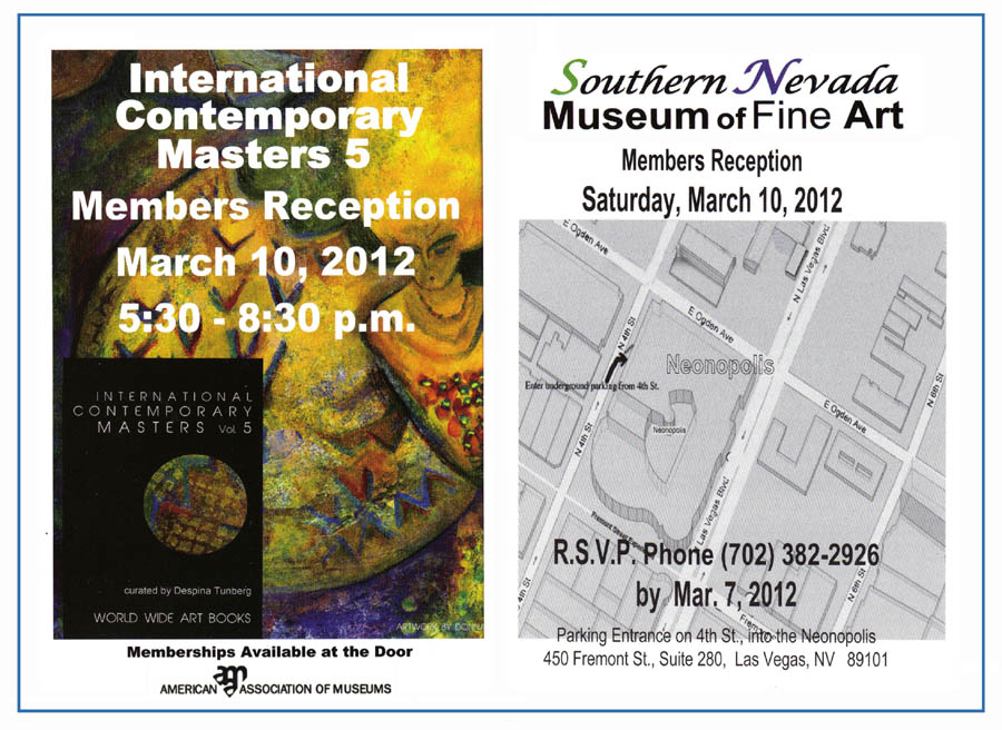 Posted on March 4, 2012 Southern Nevada Museum of Fine Art- Reception on March 10th Here is the postcard… Share this: Click to share on X (Opens in new window) X Click to share on Facebook (Opens in new window) Facebook Click to email a link to a friend (Opens in new window) Email Click to share on Reddit (Opens in new window) Reddit Like Loading... Related