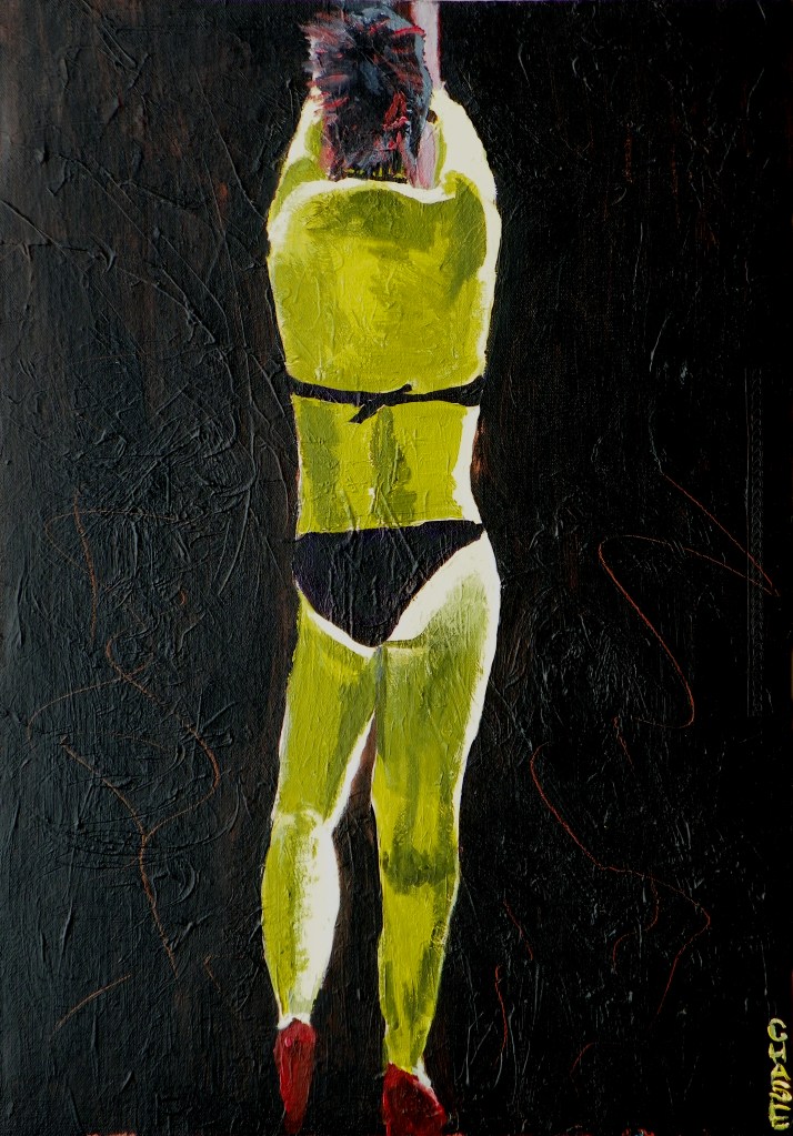 This is a painting of “M,” and I created it from a couple of photographs and it was sold! I hope to exhibit it at the Old Town Coffee and Chocolates in the fall. I took a style I saw of two artists who drew focusing on shapes and using colors more sparingly. Here it is…