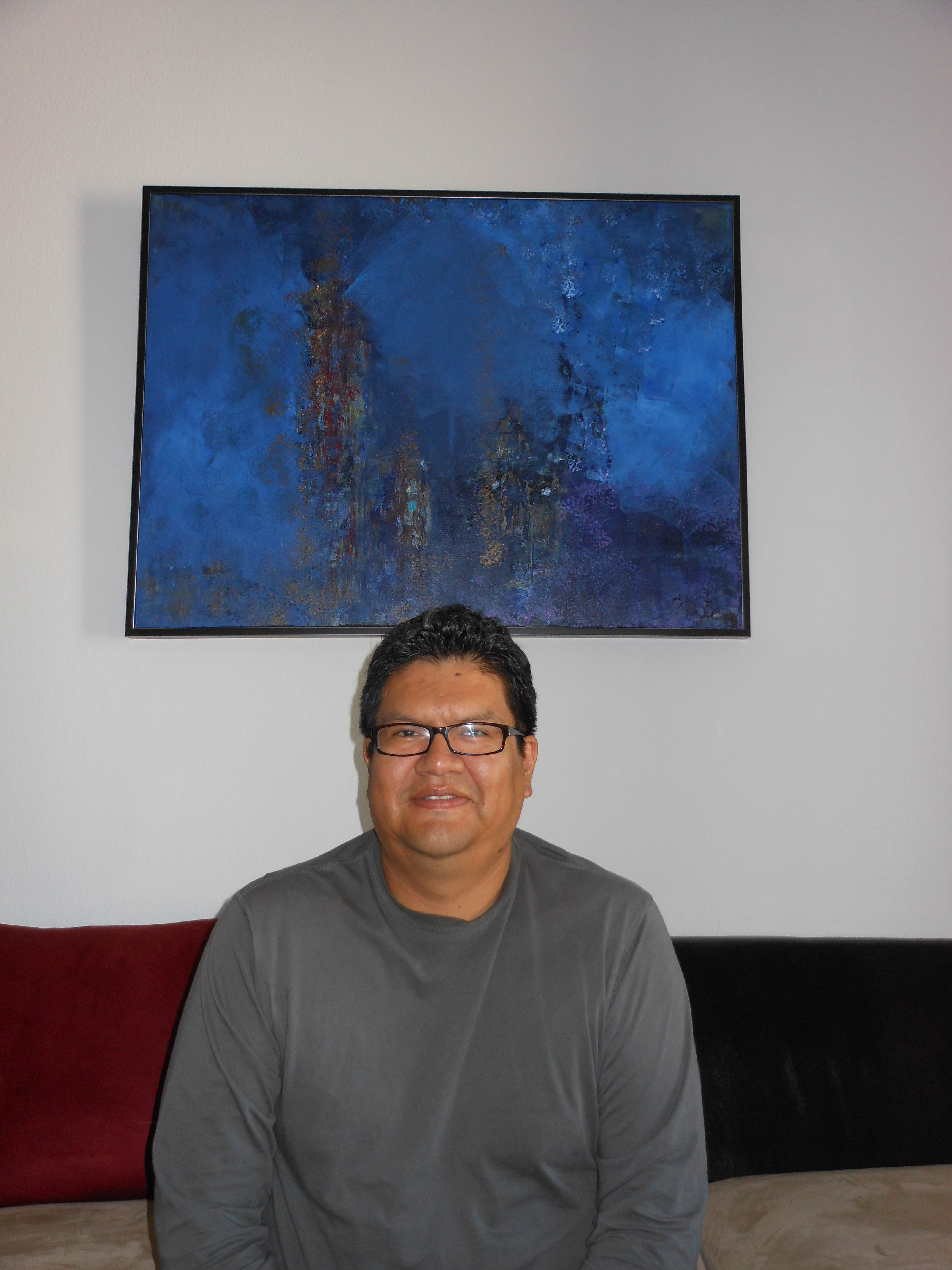 This picture was taken last fall while I was traveling to the Bay Area. This was my last abstract piece which I did in CA and I had it framed by artist, Doug Blair. The color blue was suggested by my friend and so I went over an older painting and viola! -Sheldon